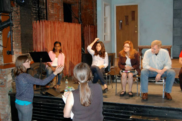 At Monday’s rehearsal, on the actual stage. Director Rose Bonczek is standing, back to camera.
