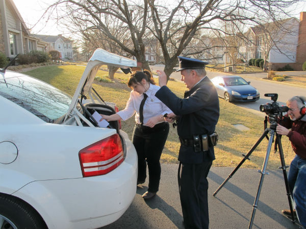 Hank Ebert (left) with Gary Reid (the police officer) and Kelly Anglim (the evidence tech) with Charlie and Martha Boswell somewhere under the sheets.