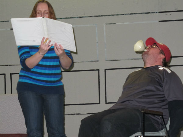 Rhonda (Heather Sexton) tries to get Zeke (Tim Kennard) sobered up.