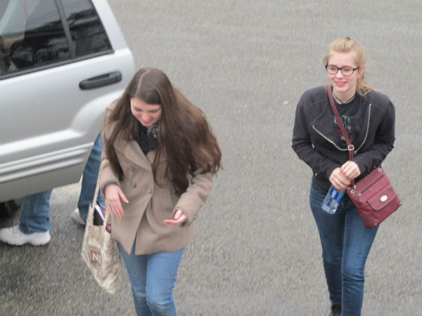 The actors -- in this case, Emma Sala and Gwyneth Strope --  arrive for the 2 p.m. rehearsal.