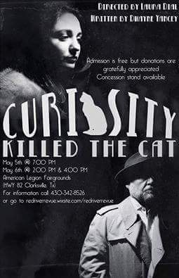 Red Revue Review in Clarksville, Texas produced my one-act CURIOSITY KILLED THE CAT May 5-6, 2017. Here’s the show poster, and photos from the set-up below: