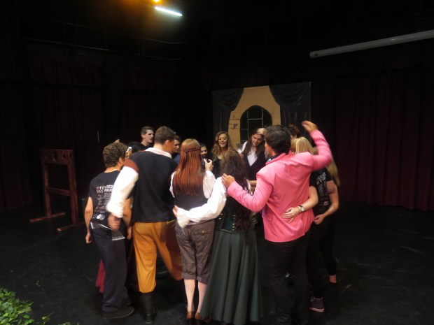 This was one of the most amazing sights I’ve seen: The cast gathers before the show for a pre-show rally, led by actor Nick Sidaris (somewhere in the center of this scrum).
