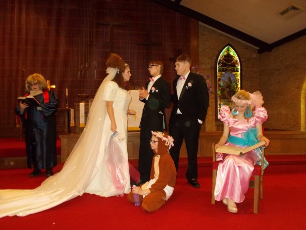 A wedding goes afoul when the ringbearer — a monkey — swallows the ring. Chaos, and comedy, ensues. Features a motorcycle gang, and someone in a monkey suit. Cast: 12 or 13 — 5 male, 5 or 6 female, 2 non-gender. Running time: 30 minutes