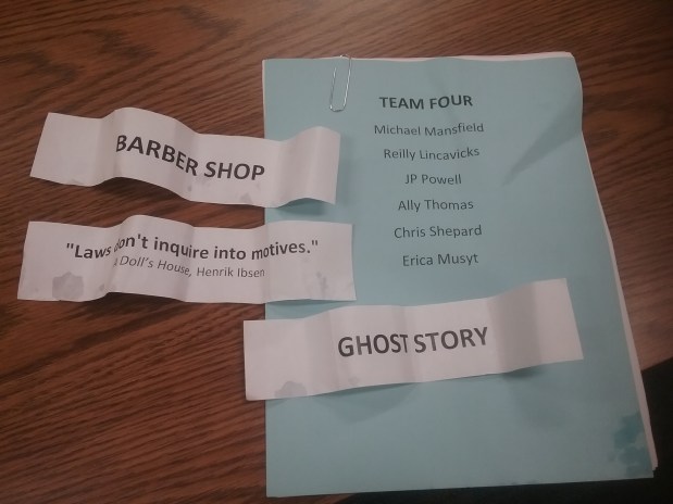 My prompts and cast. I drew a cast with a lot of musical talent so was determined to make use of those. The setting led to a barbershop quartet singing the most famous ghost story of all time — HAMLET.