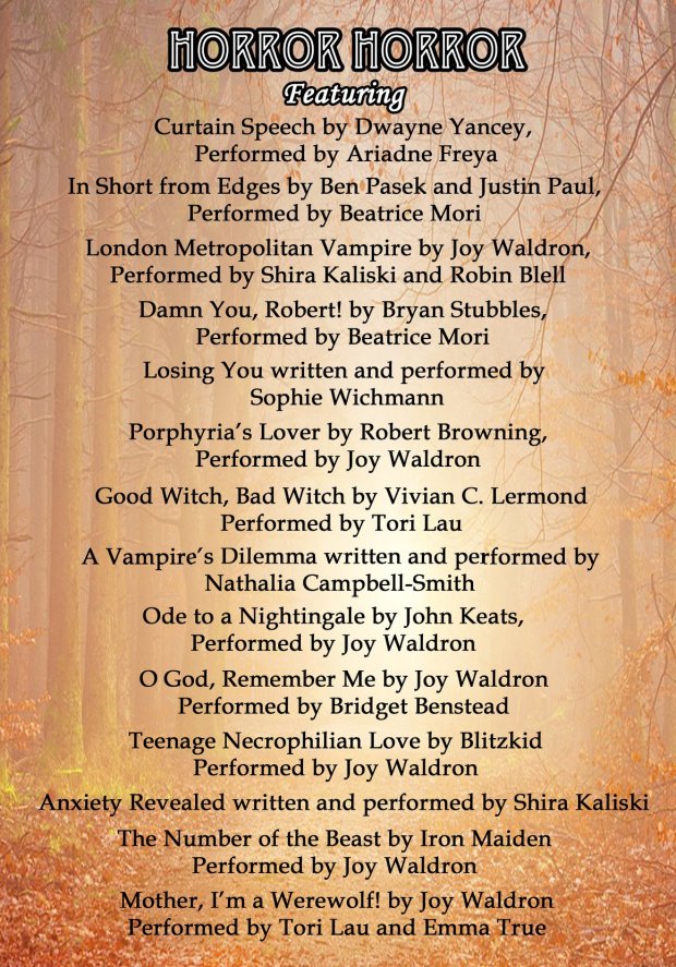 I have one piece in the one-night show Horror Horror, being presented Oct. 28 in London (yes, that London) by Bashir Productions at the Et Cetera Theatre as an industry showcase.