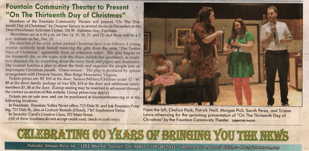 Fountain Community Theater in Fountain, Colorado produced my full-length script ON THE THIRTEENTH DAY OF CHRISTMAS in December 2018. Here are some photos.