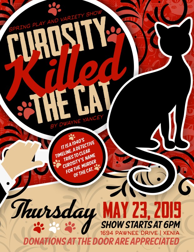 My one-act CURIOSITY KILLED THE CAT is being produced in May at Xenia Academy in Summit, Ohio, a suburb of Cincinnati. Here’s the poster.