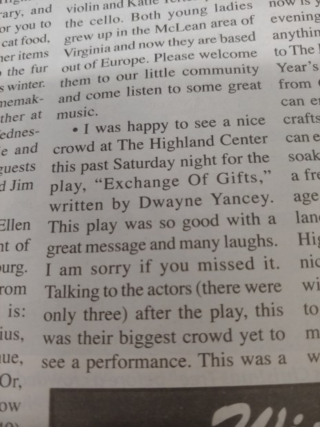 Dwayne Yancey is a playwright from the Blue Ridge Mountains of Virginia. He’s had scripts produced throughout the United States, Canada, Great Britain and other locations abroad. For more on his work, contact him directly at dwayneyancey@gmail.com.