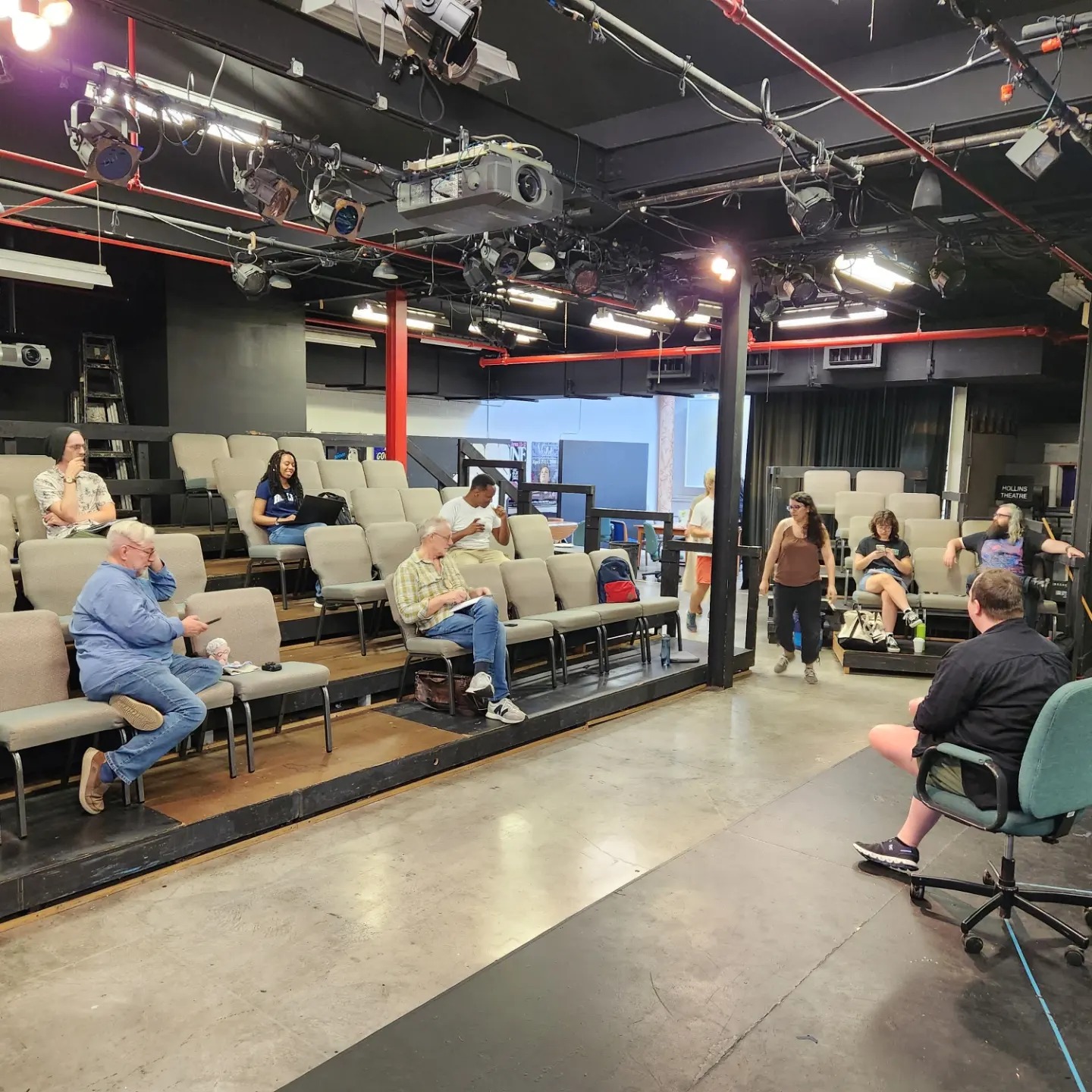 We writers gathered at 8 a.m. for a meeting with our director, followed by a production meeting led by technical director Shelby Love (in the chair on stage). This went over the order of the shows (which sometimes is dictated by production needs), how transitions will work, and any production details — light cues, sound cues, etc.