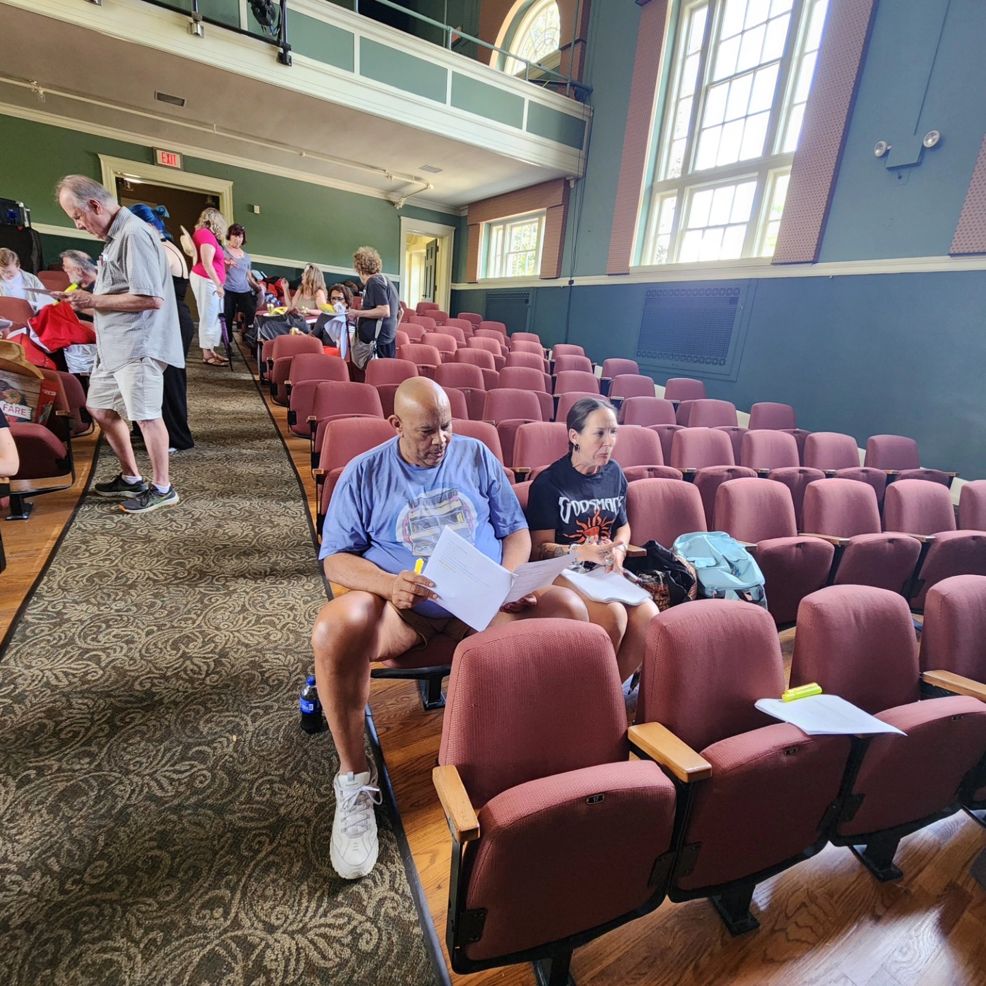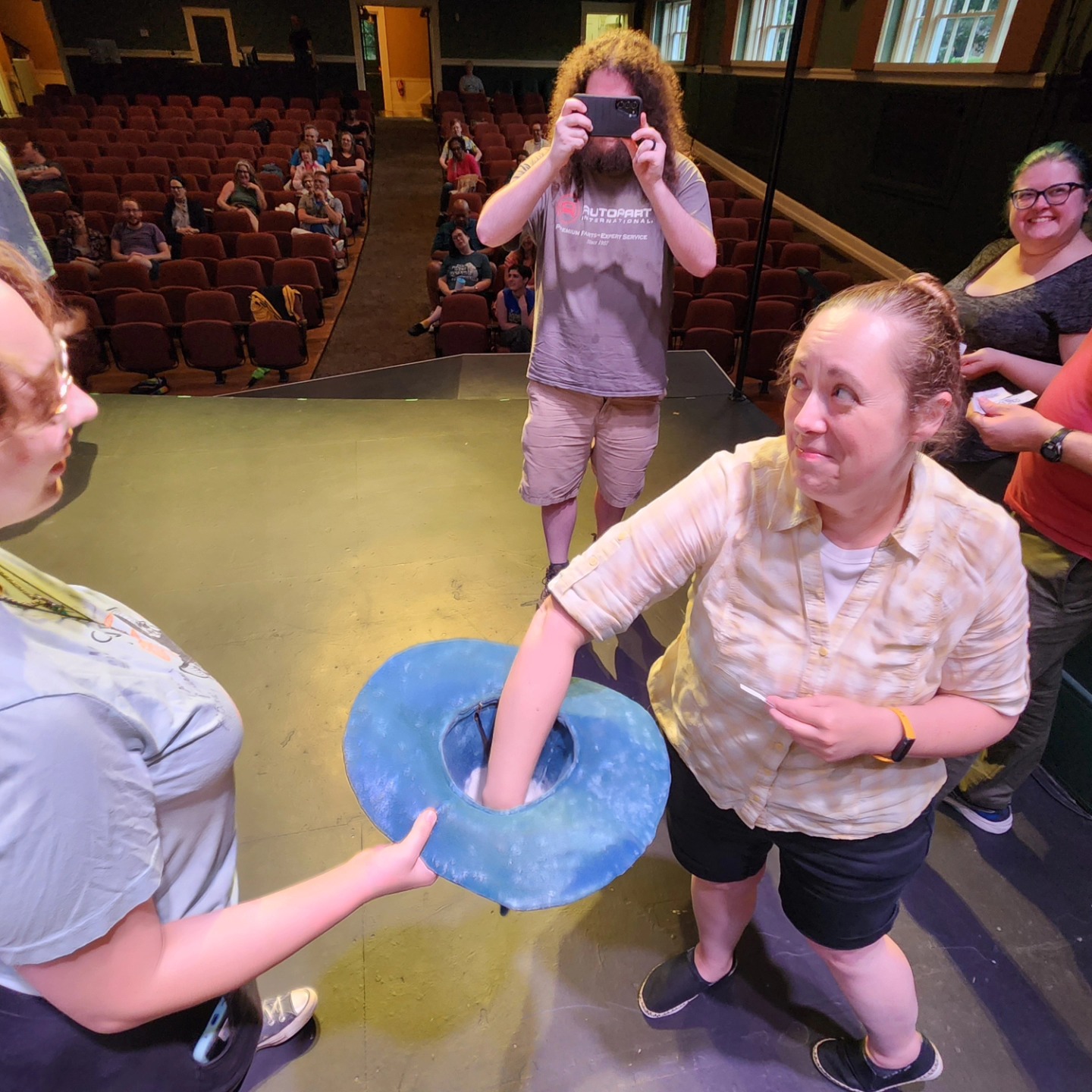 On Friday night, the six writers, six directors and many cast members gathered at Hollins. We had a ceremonial drawing of prompts, directors and casts from a hat, then we writers went off to write. I drew Natalie Tasillo as a director, sitcom as the genre, a county fair as the setting, “even a worm turns” as the theme and Team 4 for the cast. In the photo above, from left to right, that’s Lillian Savage, Natalie Tasillo, Miriam Frazier, Michael Johnson, me, and Janemarie Laucella kneeling. Out of the frame to the right is my old friend Stephen “Stevedogg” Glassbrenner. Photo courtesy of Dan Smith. I felt I lucked out because I normally write comedy, a rural setting is a natural for me and I knew all of the actors except Lillian. In fact, Miriam directed one of my shows in a previous Overnight Sensations, so I could hear all their voices in my head as I was writing “Cock-A-Doodle-Did.”