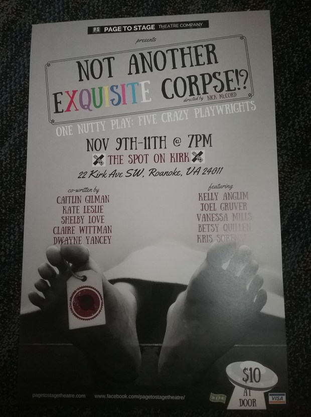 Director Nick McCord asked me if I’d be one of five playwrights in a semi-collaborative project called NOT ANOTHER EXQUISITE CORPSE? The deal was one playwright would write 15 pages, then pass it on to the next playwright, who would only see the first playwright’s last two pages, and so forth and so on.