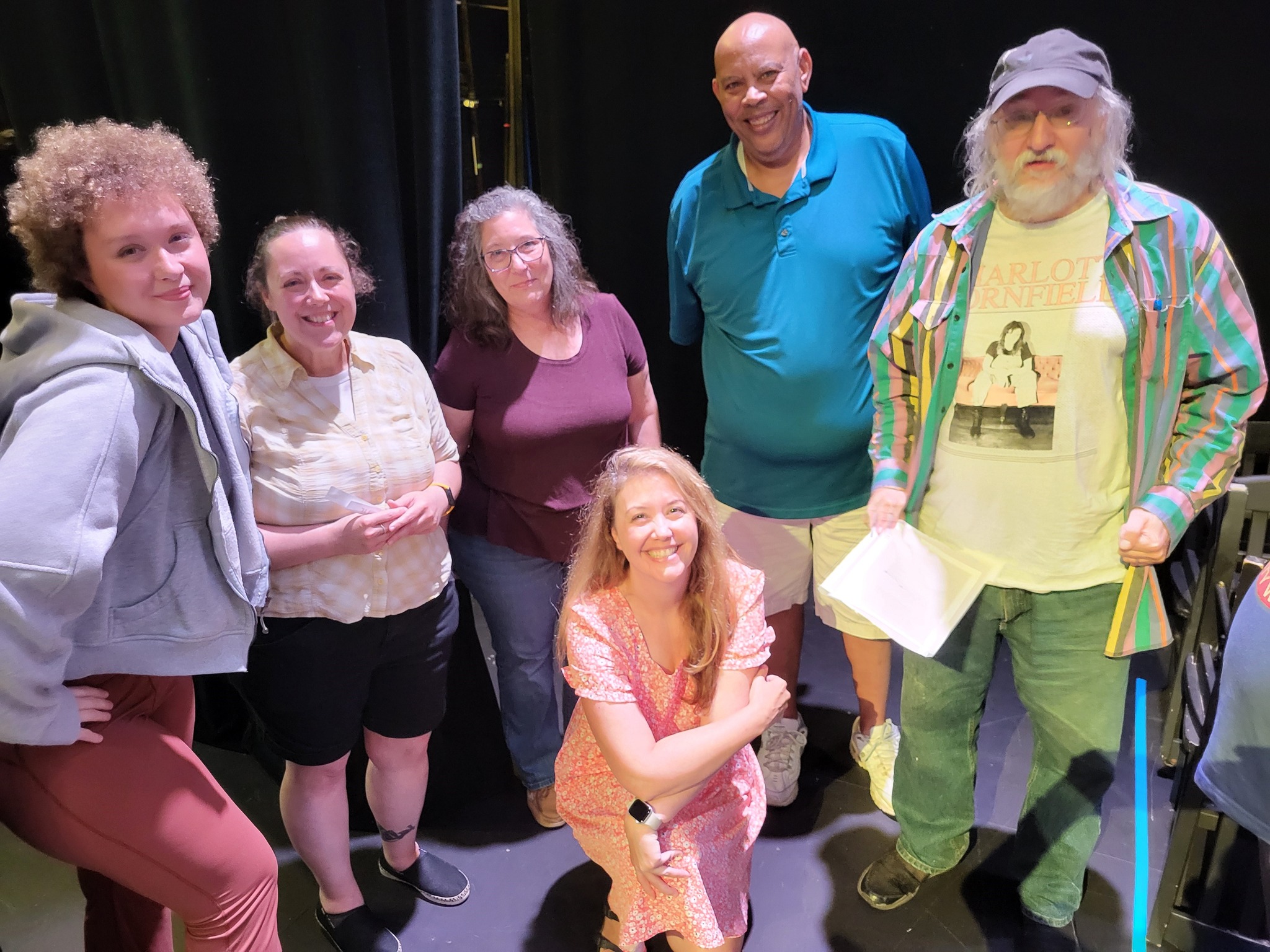 On Friday night, the six writers, six directors and many cast members gathered at Hollins. We had a ceremonial drawing of prompts, directors and casts from a hat, then we writers went off to write. I drew Natalie Tasillo as a director, sitcom as the genre, a county fair as the setting, “even a worm turns” as the theme and Team 4 for the cast. In the photo above, from left to right, that’s Lillian Savage, Natalie Tasillo, Miriam Frazier, Michael Johnson, me, and Janemarie Laucella kneeling. Out of the frame to the right is my old friend Stephen “Stevedogg” Glassbrenner. Photo courtesy of Dan Smith. I felt I lucked out because I normally write comedy, a rural setting is a natural for me and I knew all of the actors except Lillian. In fact, Miriam directed one of my shows in a previous Overnight Sensations, so I could hear all their voices in my head as I was writing “Cock-A-Doodle-Did.”