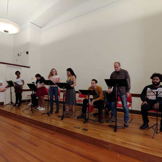 it was hard to get the whole cast in the same photo. From left: Erika DeGraff (Myth America); Esh Red (Dominique; she’s seated so hard to see here), Victoria Marliny (Esmerelda), Amina Theis (Sam), Kimberly Rios (Libby), Matt McGlade (Joe), Paul Weissman (Gordon), Brandon Bogle (Tiny).