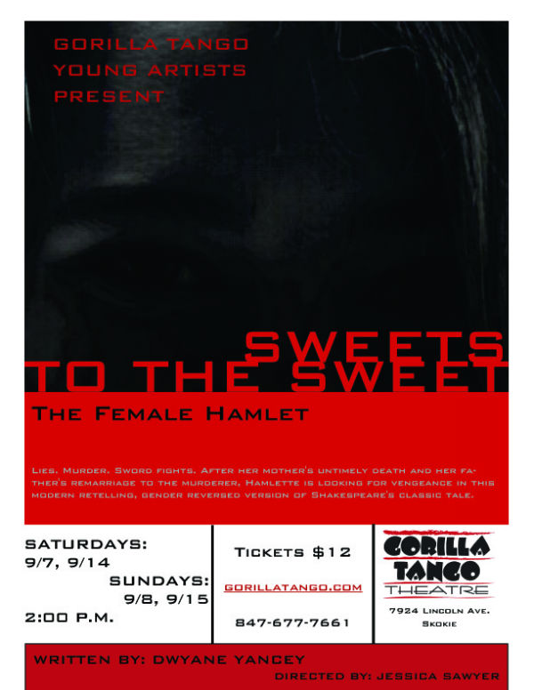 Here’s the post that the Gorilla Tango Theatre in Skokie, Illinois (Chicago ‘burbs!) is using for my show “Sweets to the Sweet.” This is a modern version of Hamlet, with a gender-reversed cast — so Hamlet becomes Hamlette, Ophelia becomes Phil and so forth.