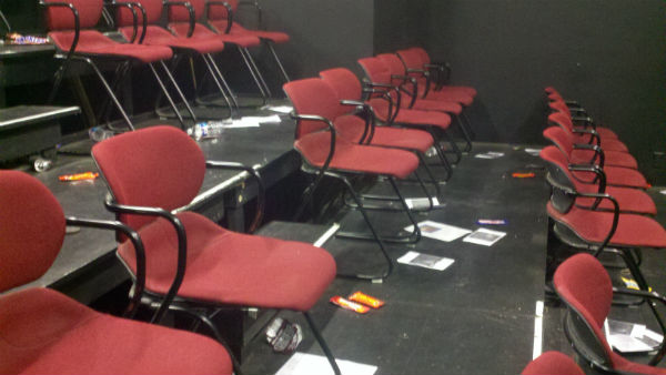 The “wreckage” of the theatre. The audience entered to find chairs overturned and the space littered with programs (in Russian), water bottles and candy wrappers.