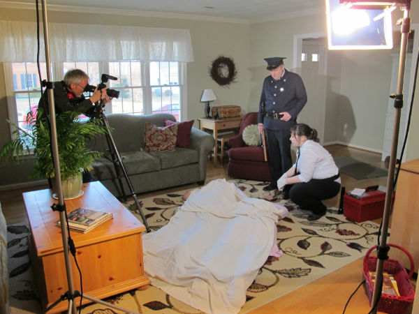 Hank Ebert (left) with Gary Reid (the police officer) and Kelly Anglim (the evidence tech) with Charlie and Martha Boswell somewhere under the sheets.